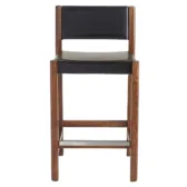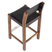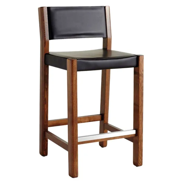 Ash Wood Frame Counter Stool with Saddle Leather Seat and Back with Stitched Exposed Seams and Brass Studs.